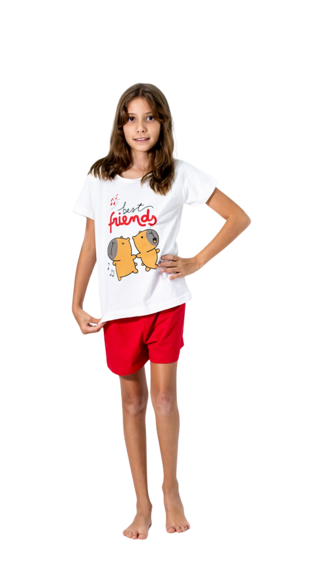 Pijama juvenil manga curta na cor marfim e shorts liso na cor vermelho